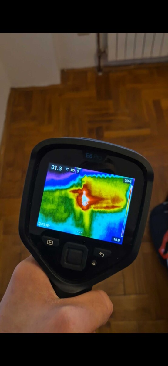 Koristimo profesionalnu termovizijsku kameru FLIR E6 PRO koja detektira temperaturne razlike u zidovima i podovima. Vlažna područja imaju drugačiju temperaturu od suhih, što nam omogućuje precizno lociranje izvora curenja bez rušenja.