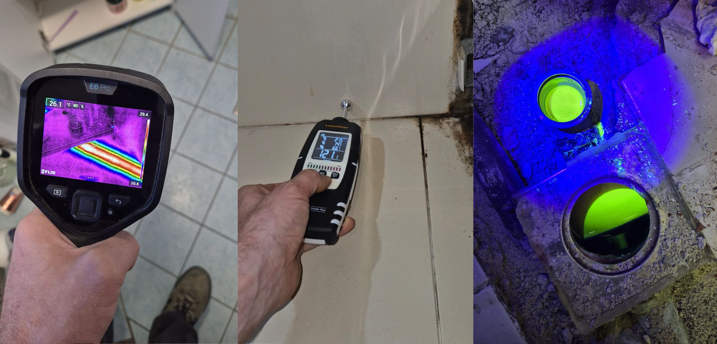 Koristimo vlagometar za mjerenje vlage u zidovima, tlačnu probu za dovodnu instalaciju, FLIR termovizijsku kameru E6 PRO za termografsko snimanje i vlagometar za precizno traženje lokacije curenja.